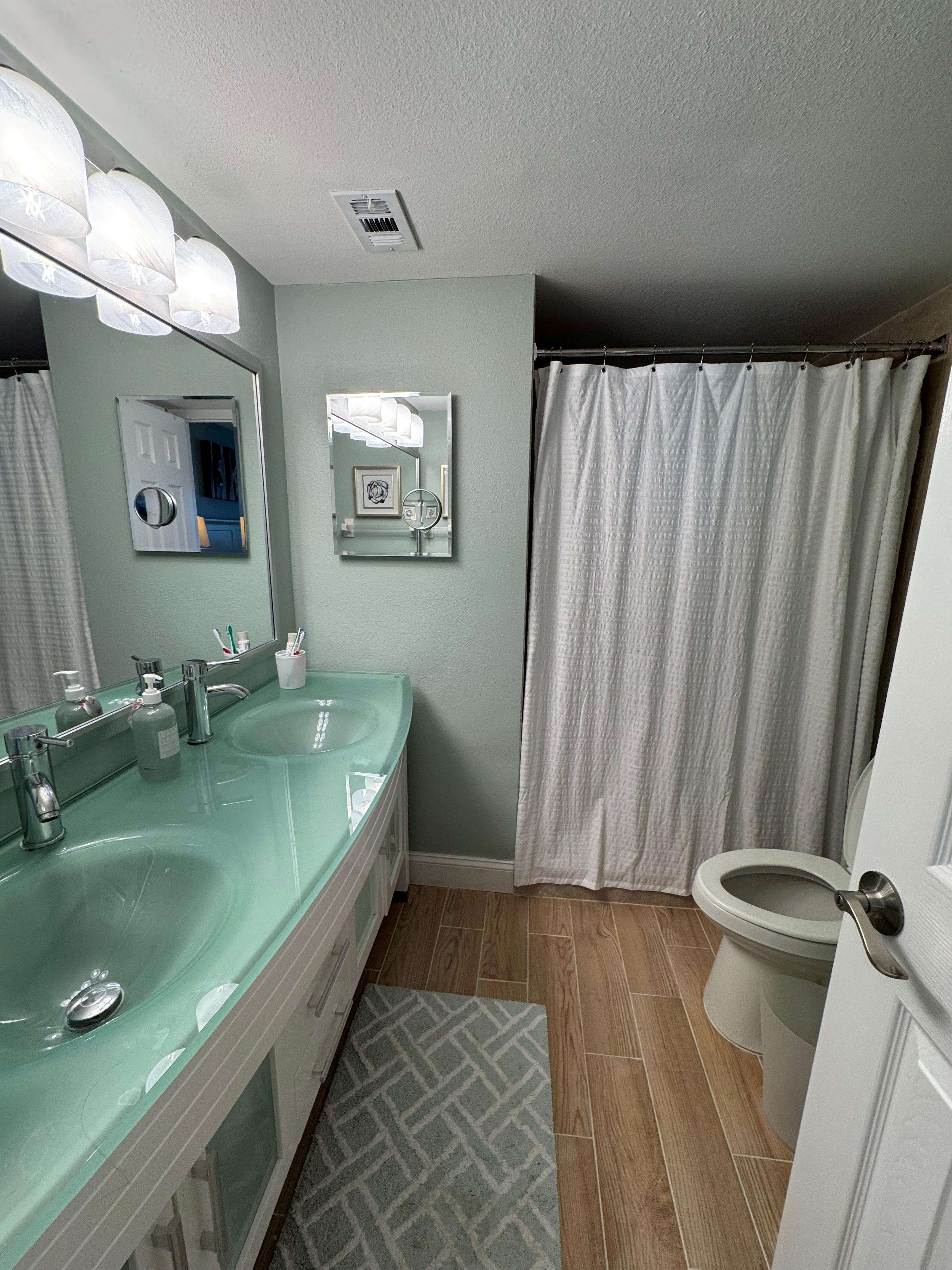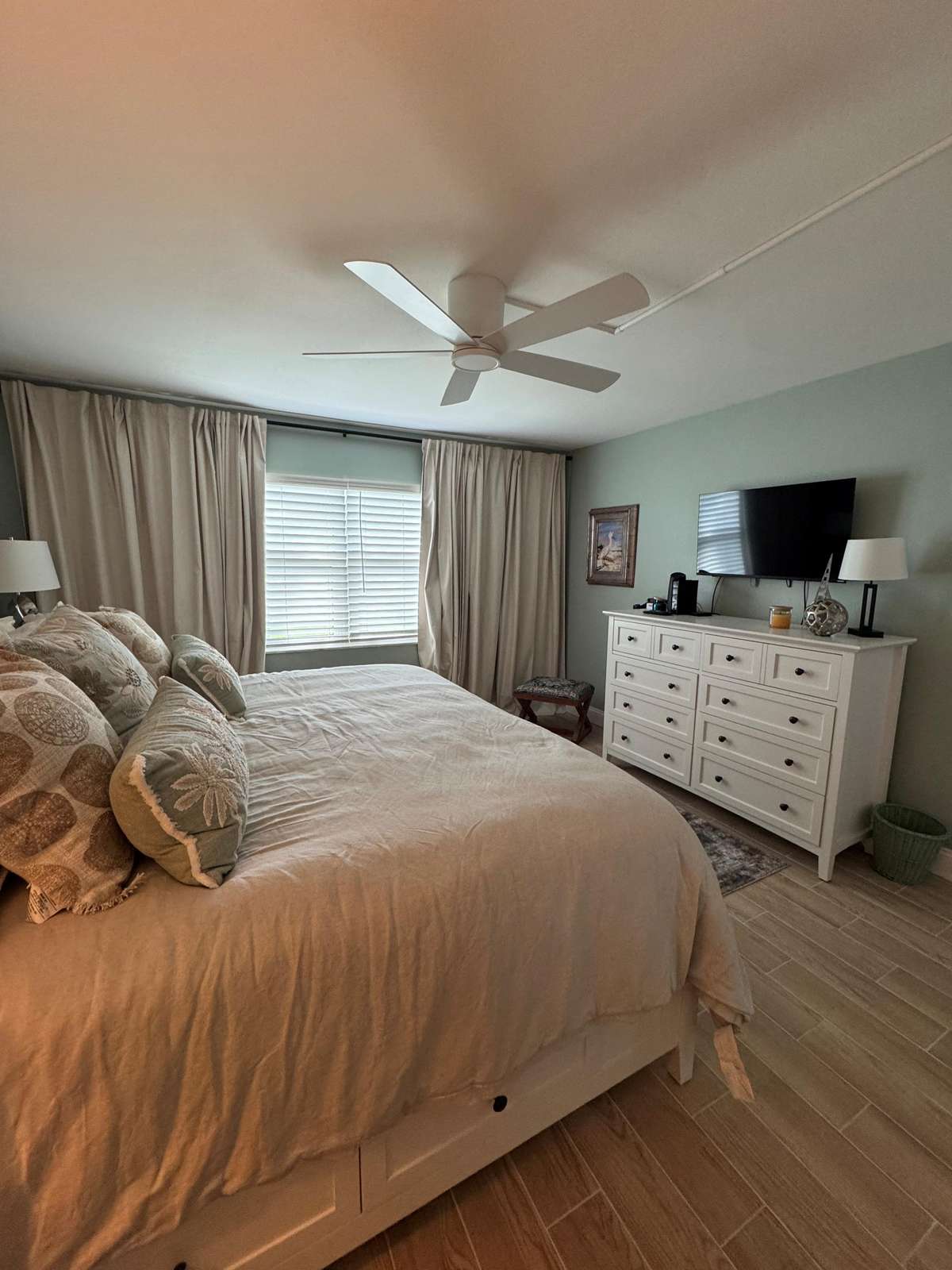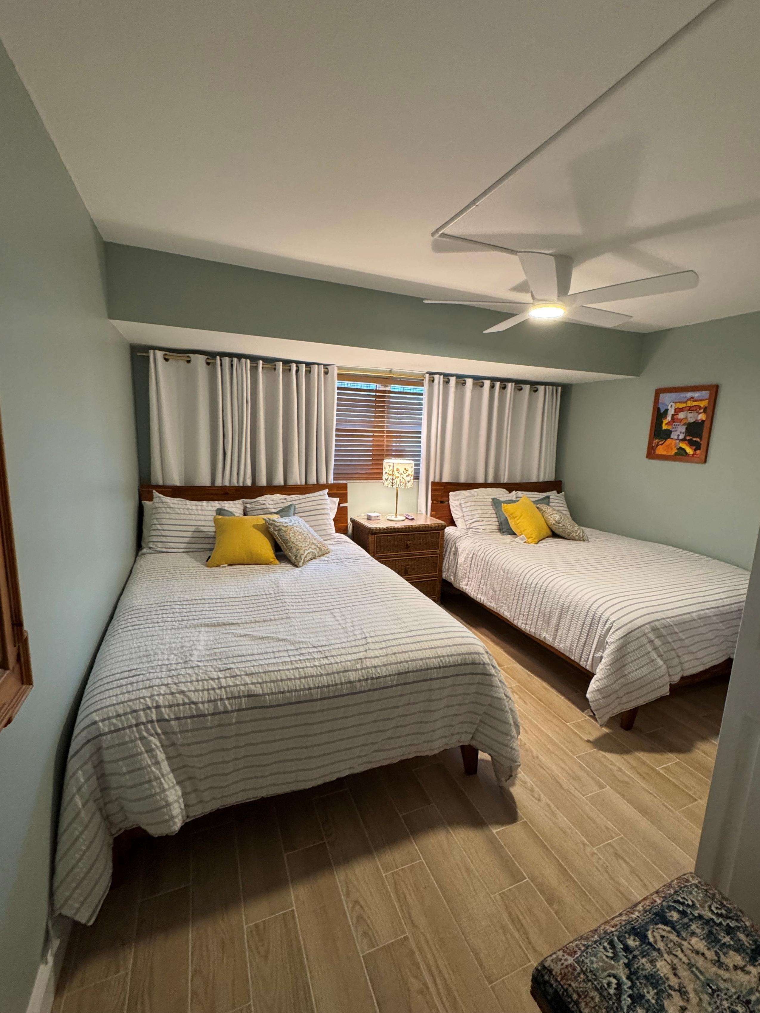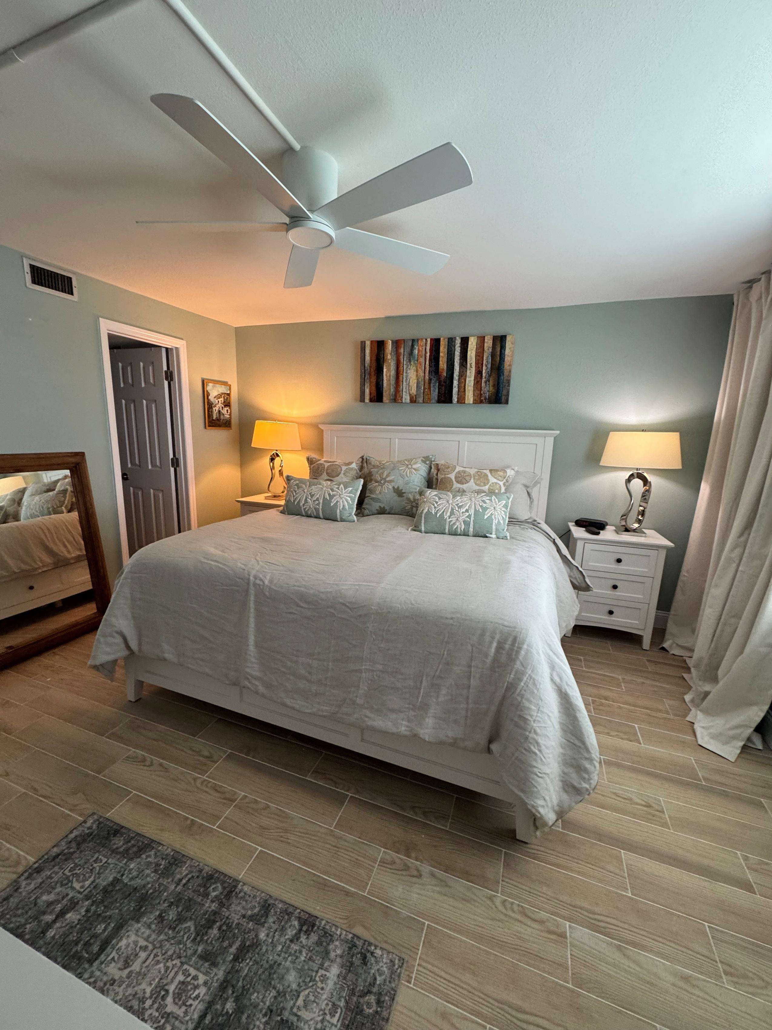 Two bedroom Two bath with a king bed in the master bedroom. The guest bedroom has two double beds and its own t.v. The building has WIFI, two gas grills and a heated pool overlooking the Gulf of Mexico. (SEVEN NIGHT MINIMUM)
